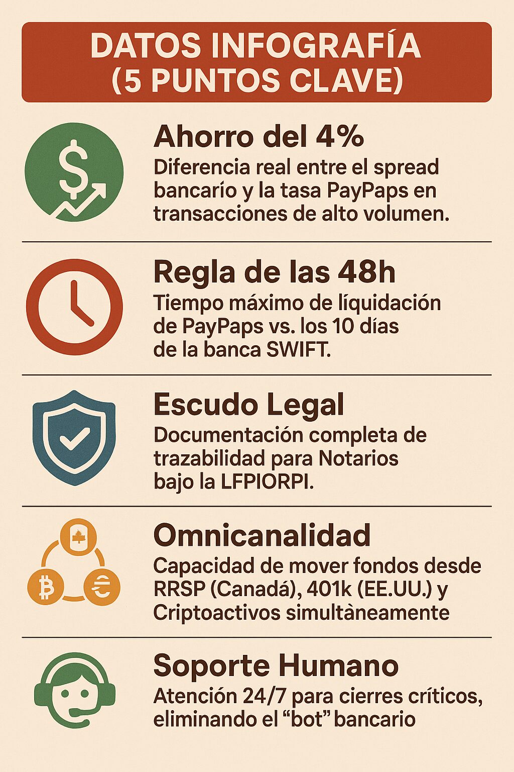 Para entender el impacto real de una correcta Gestión de patrimonio inmobiliario México 2026, consideremos el caso de una desarrolladora en Los Cabos. Un inversor canadiense buscaba adquirir una villa de $4.5M USD. El capital se encontraba en una cuenta de inversión RRSP en Canadá. La banca tradicional estimaba 10 días para el wire internacional y una pérdida por spread de aproximadamente $180,000 USD.